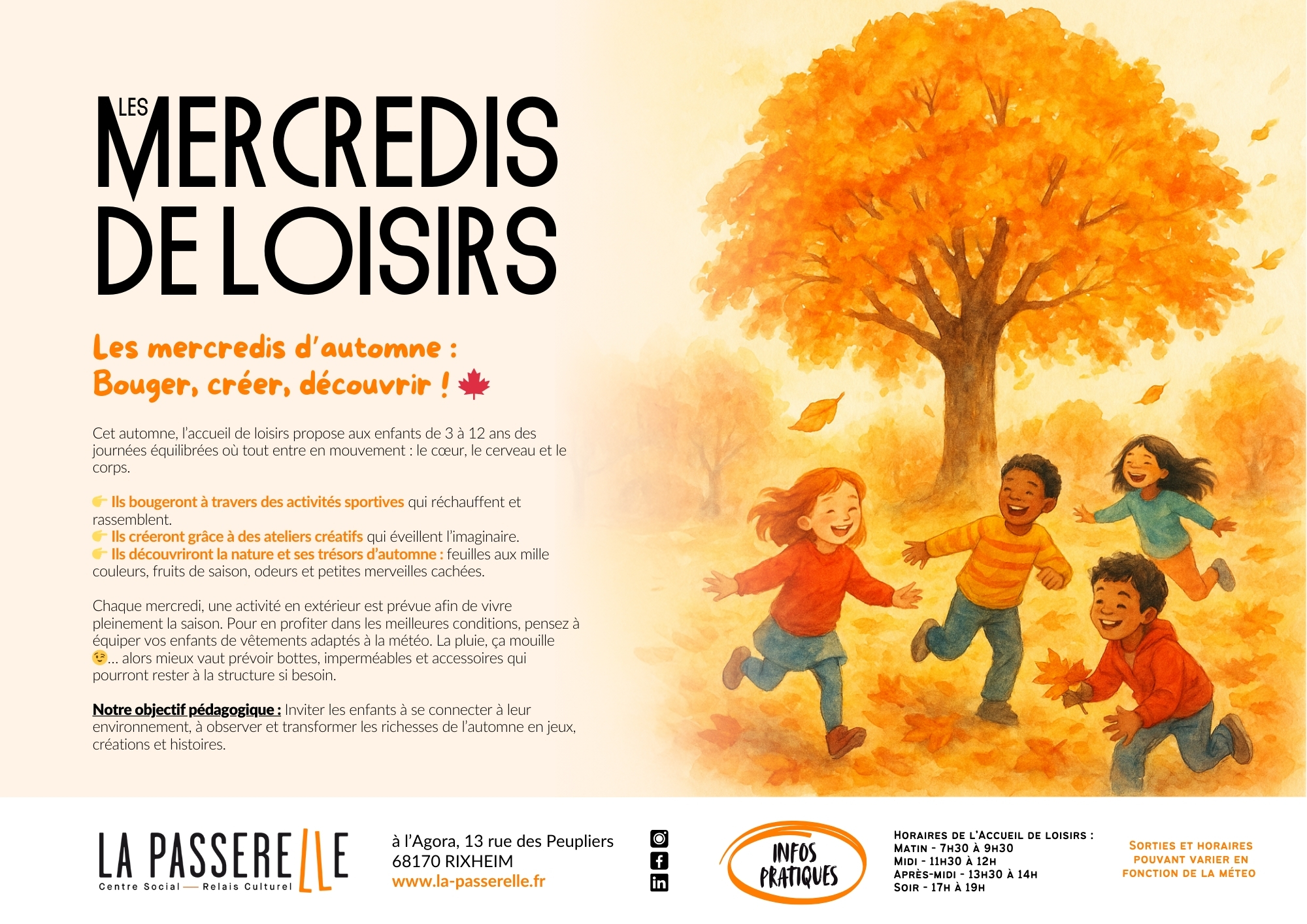 Retrouvez les Mercredis de Loisirs, tous les mercredis hors période de vacances scolaires, de 7h30 à 19h à L'Agora, 13 rue des Peupliers, 68170, Rixheim (quartier Entremont).