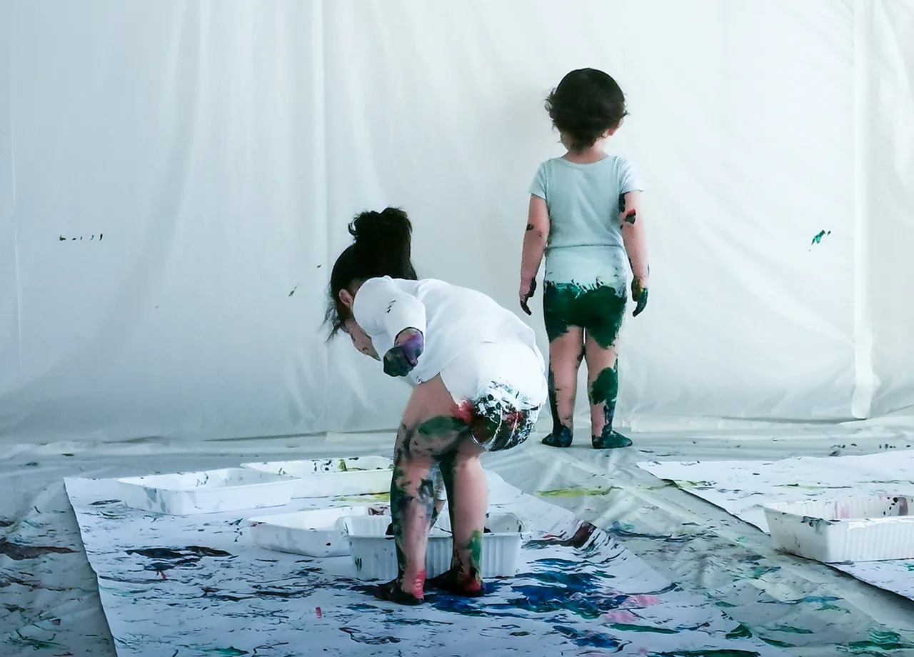 Une salle entièrement protégée, “bachée”, où les enfants peuvent peindre partout : au sol, sur les murs, avec les mains, les pieds… et même avec tout le corps si l’envie est là.